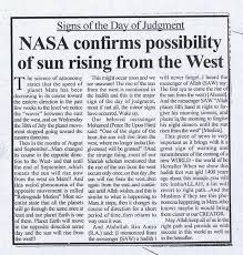 1.400 tahun yang lalu, Rasulullah SAW sudah menyatakan dalam haditsnya bahwa kelak matahari akan terbit dari Barat sebagai bukti keagungan Allah SWT dan ciri-ciri kiamat sudah semakin dekat: ““Tidak akan terjadi kiamat sehingga matahari terbit dari tempat terbenamnya, apabila ia telah terbit dari barat dan semua manusia melihat hal itu maka semua mereka akan beriman, dan itulah waktu yang tidak ada gunanya iman seseorang yang belum pernah beriman sebelum itu.” (Riwayat Bukhari dan Muslim dari Abu Hurairah. Dan riwayat Ahmad, Abu Dawud dan Ibn Majah).